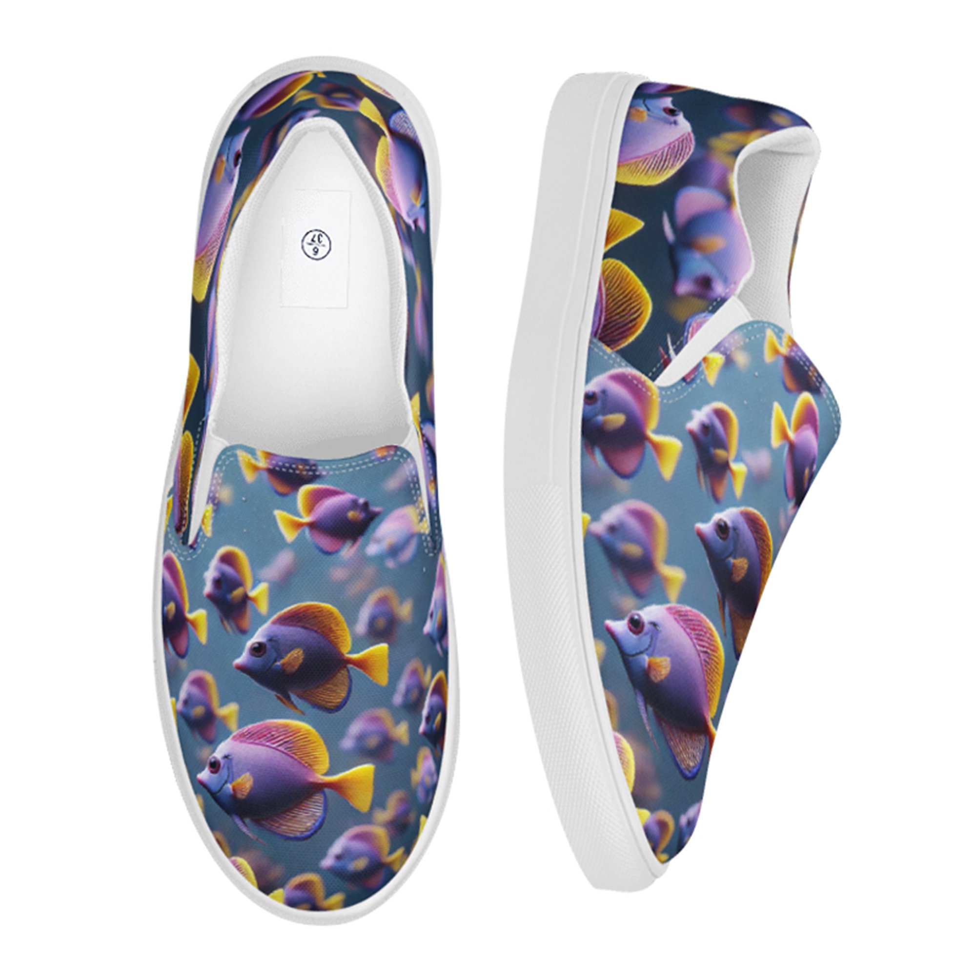 These 3D Royal Gramma sea life shoes, features a bold blend of deep purple and vibrant yellow fins, inspired by the striking colors of these tropical fishes. Lightweight and fun to wear, they offer a standout style. Perfect for ocean lovers or anyone drawn to unique, nature-inspired designs, these shoes bring reef life to a sophisticated glide undersea.