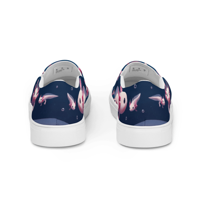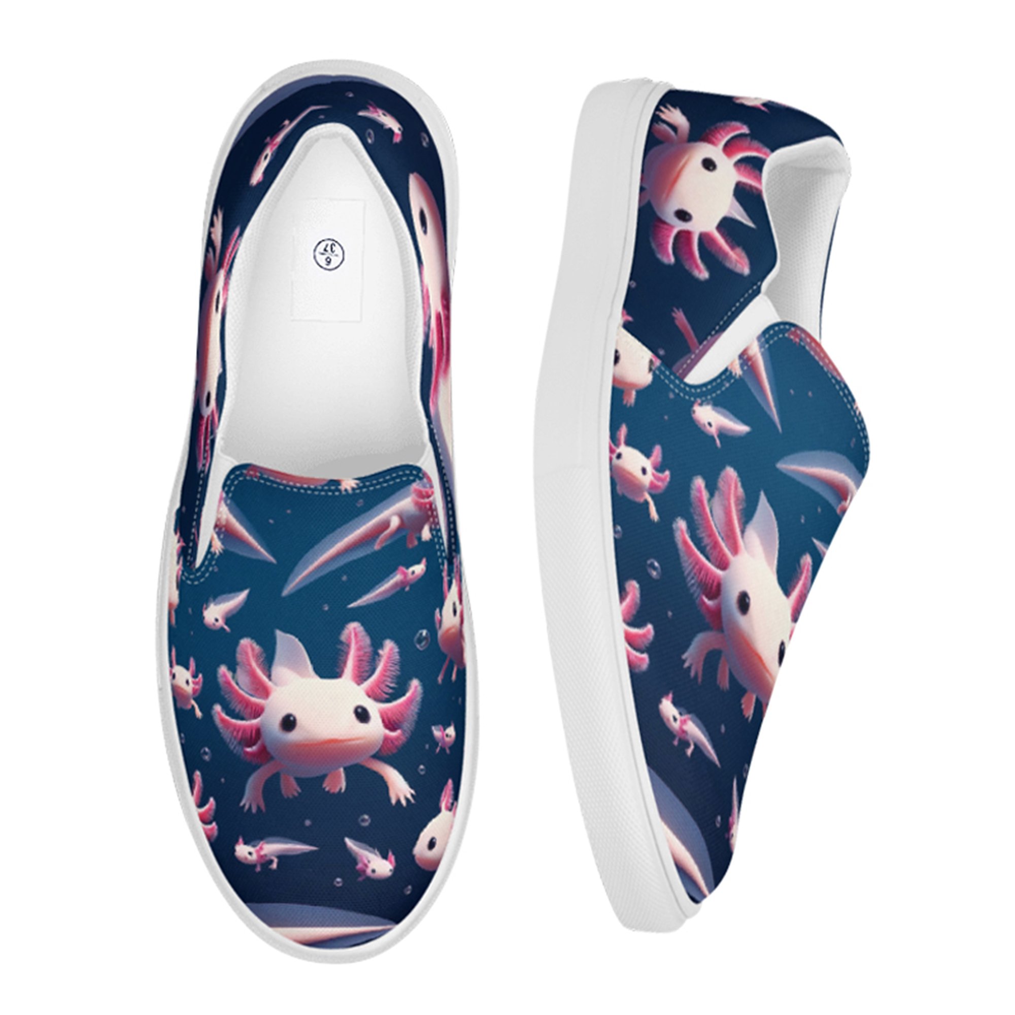 Step into the Sealife with these unique Albino Axolotl slip-on shoes! Lightweight, breathable, and easy to wear. A perfect gift for axolotl lovers, ocean lovers and marine biologists. These canvas shoes will stand out of the ordinary shoes just don’t gill it!