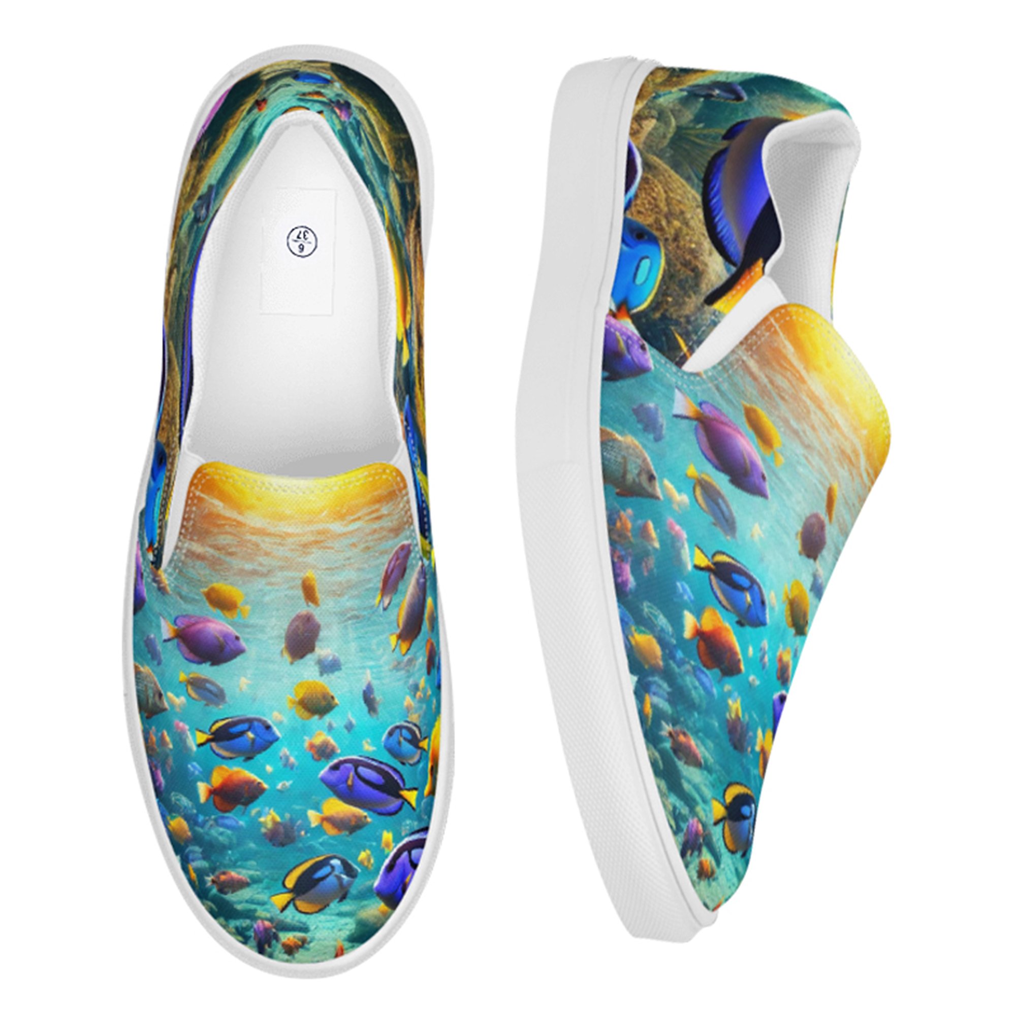 Crafted from breathable canvas, these shoes are made for comfort and casual wear. These blue fish print pops against a ocean-toned background, making them perfect for marine life enthusiasts, aquarium visitors, or anyone who wants a splash of color in their step.