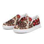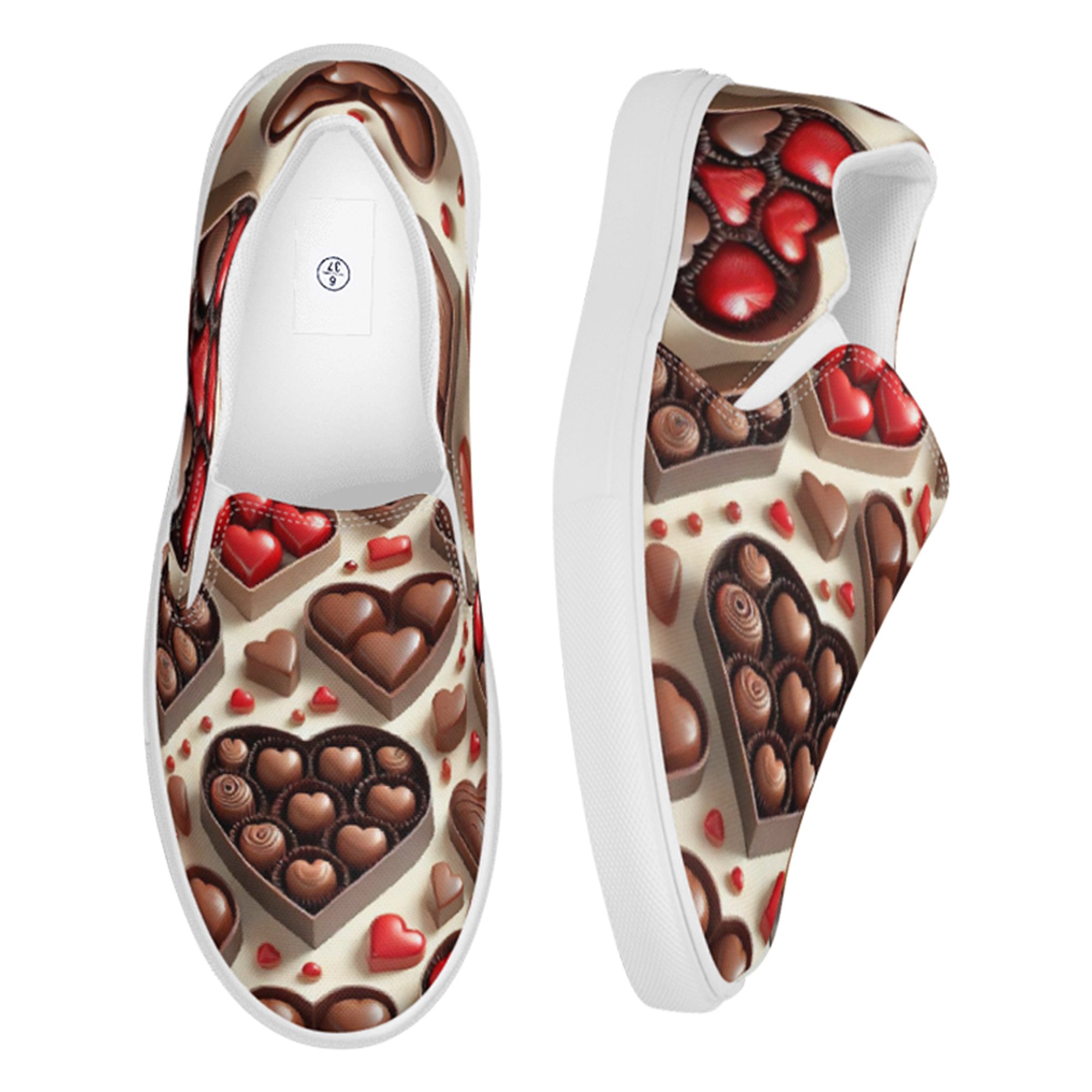 Treat your feet to these Chocolate Heart Candy Slip-Ons. A delicious blend of comfort and charm. Featuring a yumme print of classic heart-shaped chocolate candies wrapped in rich cocoa and red tones, these shoes are for anyone who loves candy and has a big heart.