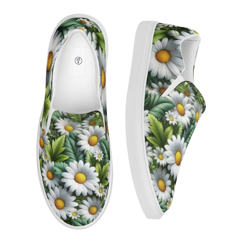These charming white daisy flower canvas slip-on shoes bring a fresh, cheerful touch to any outfit. Made with breathable, lightweight canvas, they feature delightful daisy prints that radiates a sunny, casual vibe. The slip-on design ensures easy wear. Perfect for spring and summer strolls, picnics, or adding a floral flair to your everyday style, these shoes combine charm and versatility in one garden package. Great for people who love flowers or gardening.