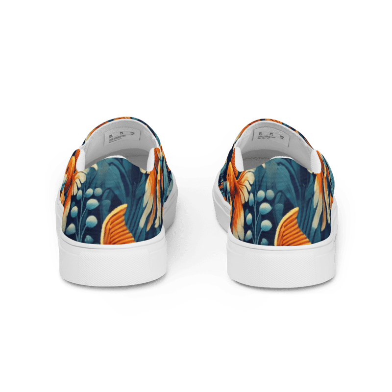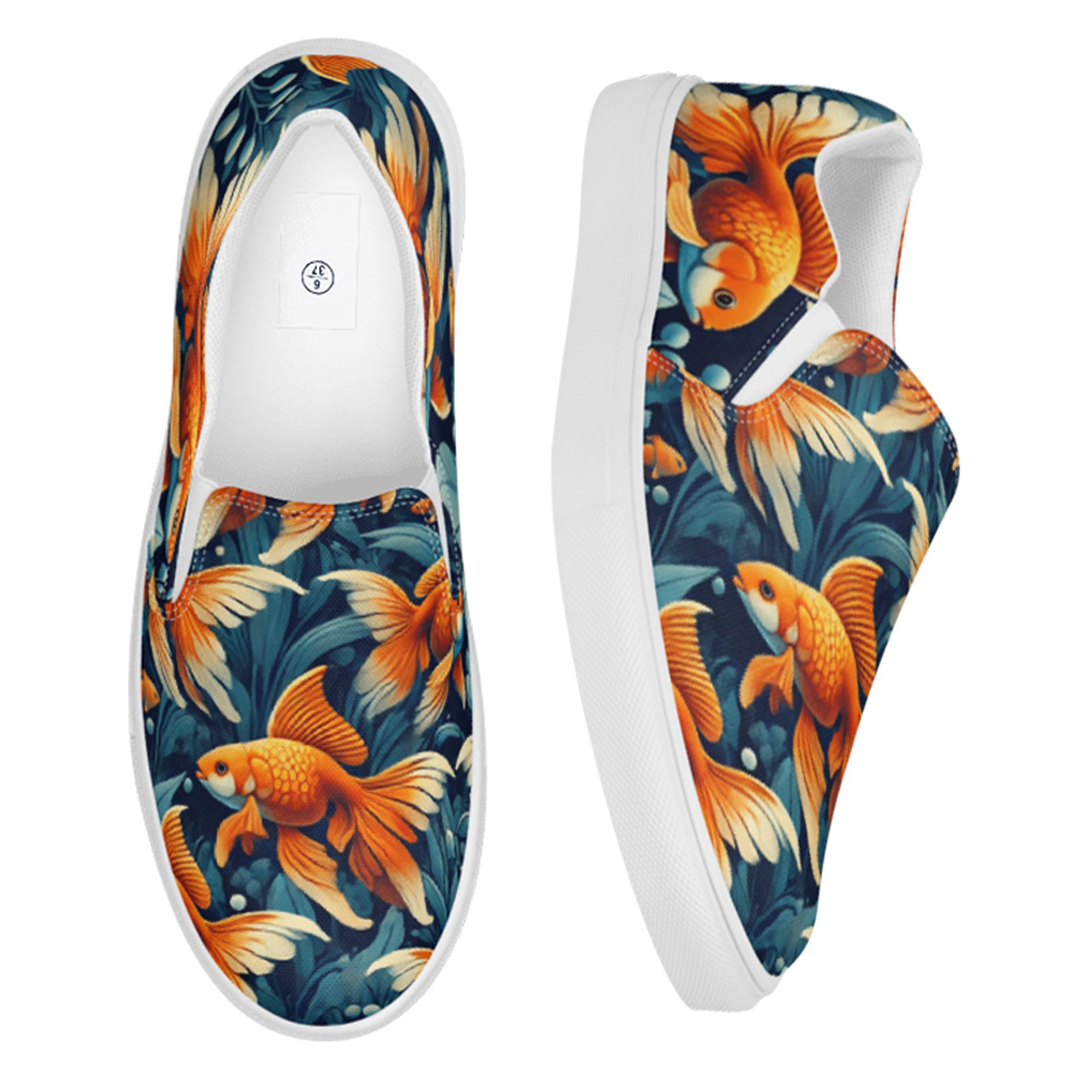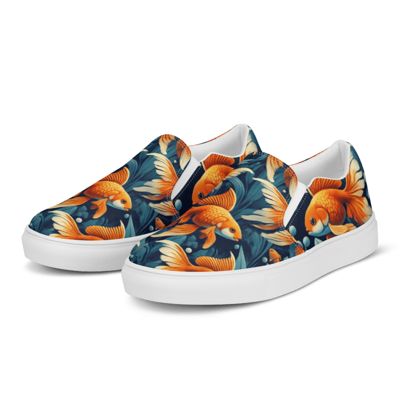 Swim into standout style with these charming Goldfish Print Shoes. Featuring graceful, flowing goldfishes in vivid orange tones against a clean, aquatic-inspired backdrop, these shoes capture the serenity and motion of pond life with a fresh, artistic twist.