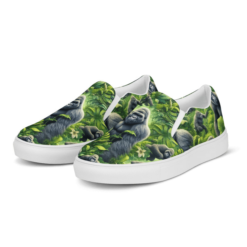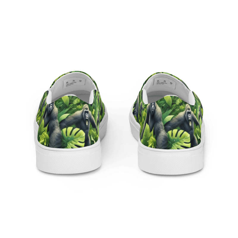 Command the wild in style with these Jungle Gorilla slip-on shoes, featuring a bold, artistic print of a powerful gorilla set deep within lush, tropical foliage. With deep greens, shadowy textures, and striking gorilla imagery, these shoes capture the strength, mystery, and majesty of the jungle’s most iconic guardian.