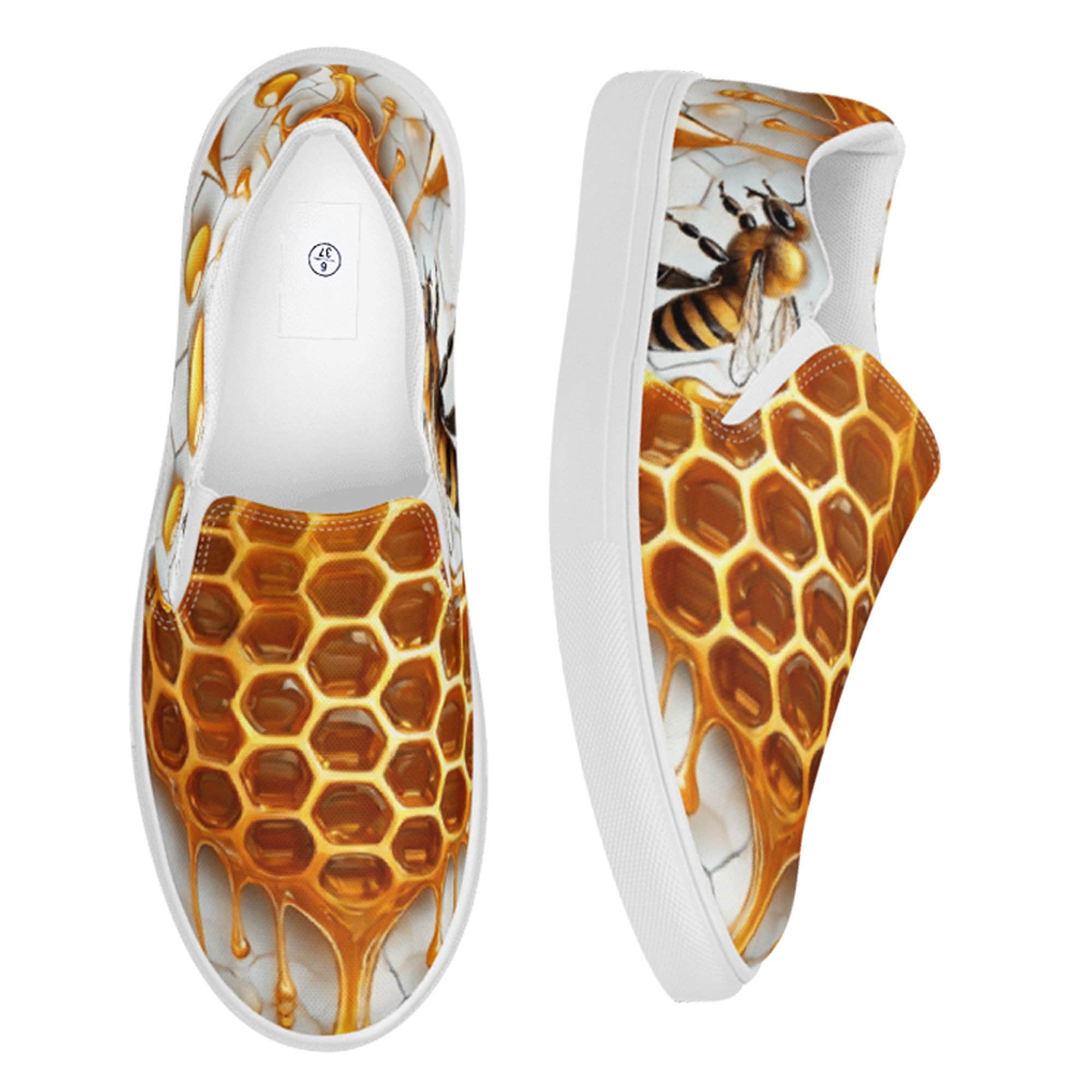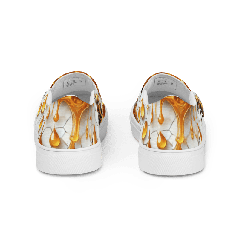 Sweeten every step with these Dripping Honey slip-on shoe. Featuring a rich, golden honey design that looks as luscious as it feels comfortable. The mouth watering print captures thick, golden honey in mid-drips. Perfect for those who love bees, bold patterns, warm tones, and nature-inspired style.