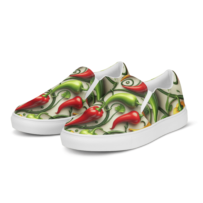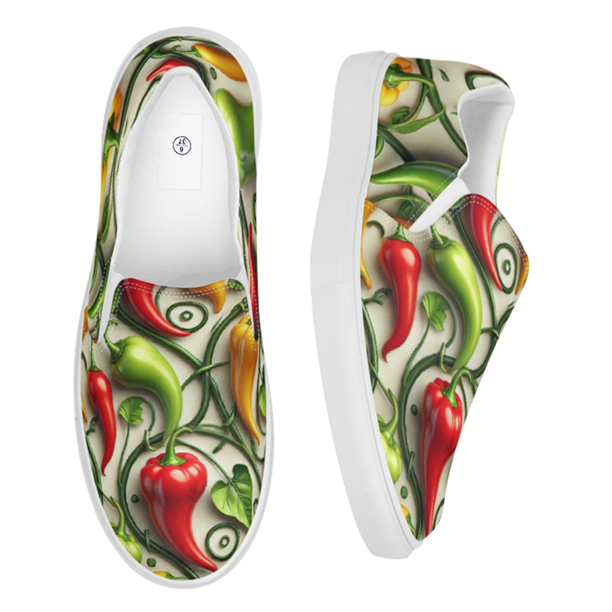 Turn up the flavor and the color with these Yellow, Red and Green Pepper Canvas Slip-On Shoes. Featuring a beautiful print of colorful bell peppers. These shoes are the perfect pick for foodies, gardeners, or anyone with a taste for eye-catching design.
