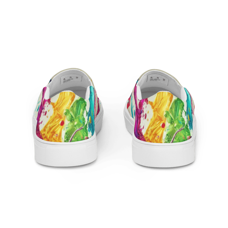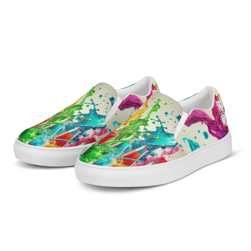 Step into color with the Juice Splash Canvas Shoes by Audvon. Featuring a vibrant splash pattern in red, blue, green, yellow, and purple, these shoes are made to turn heads and splash with every step.