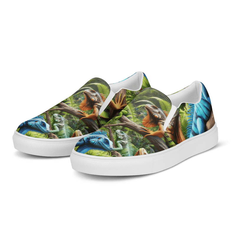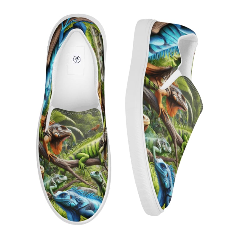 Channel the wild side of the rainforest with these Iguana canvas slip-on shoes. Featuring detailed illustrations of jungle-dwelling lizards camouflaged among vibrant leaves and tropical foliage. With rich greens, forest colors, these shoes bring a cool, nature-inspired edge to your everyday style.