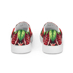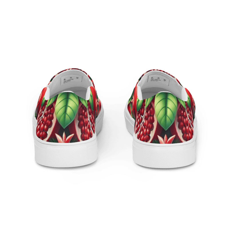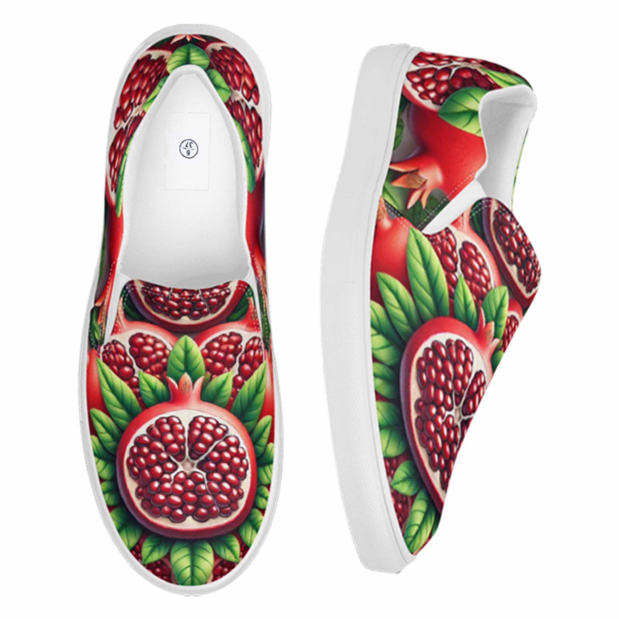 Add a burst of bold beauty to your step with these Pomegranate Slip-On Shoes. Featuring a rich, artistic design inspired by the unique and vibrant skin of the beloved pomegranate fruit. With deep crimson hues, botanical details. These canvas shoes offer a perfect blend of fruit with elegance.