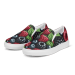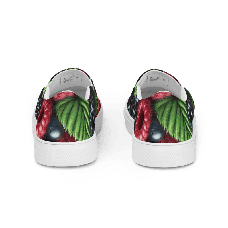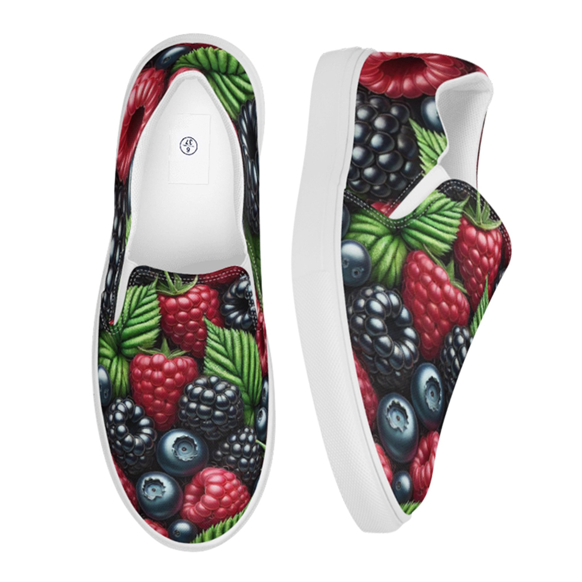Add a burst of berry flavor to your step with these Raspberry and Blackberry Slip-On Shoes. A juicy fusion of fun, color, and comfort. Featuring a vivid, all-over print of ripe raspberries, blackberries and blueberries nestled among green leaves. These shoes serve up the perfect balance unique style and sweet charm.