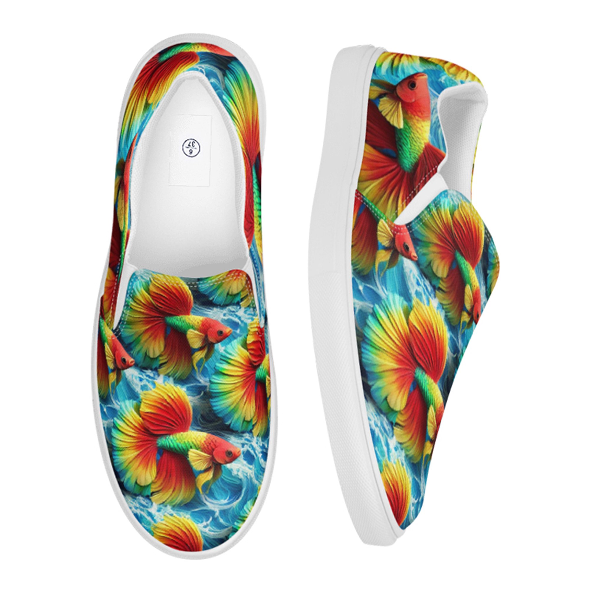 These unique Betta fish shoes are a vibrant blend of art and culture. Showcasing a striking betta fishes with flowing fins in bold red, yellow, and green hues, they capture the lively spirit of reggae style. The detailed aquatic design pops against the sturdy canvas, while the slip-on fit provide all-day comfort. Perfect for sea lovers, rasta culture fans, or anyone who loves the beach.