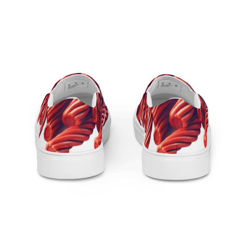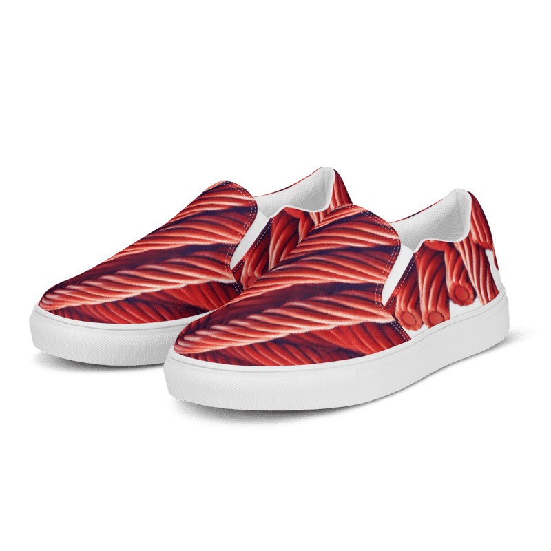 Bring a sweet twist to your step with these Red Vines Slip-On Shoes. Inspired by the classic red licorice treat. Featuring a bold, candy-striped design. These shoes blend unique nostalgia with everyday comfort.